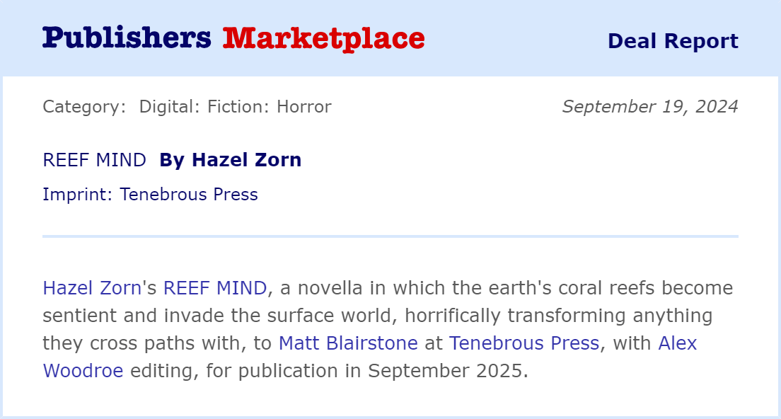 And now, the exciting news: I signed my debut with Tenebrous Press. REEF MIND is scheduled to invade your shores around September 2025. I’ve talked to Matt and Alex. I’ve signed the contract. I’ve seen a cover mockup (!!). Publisher’s marketplace announced it all official-like.